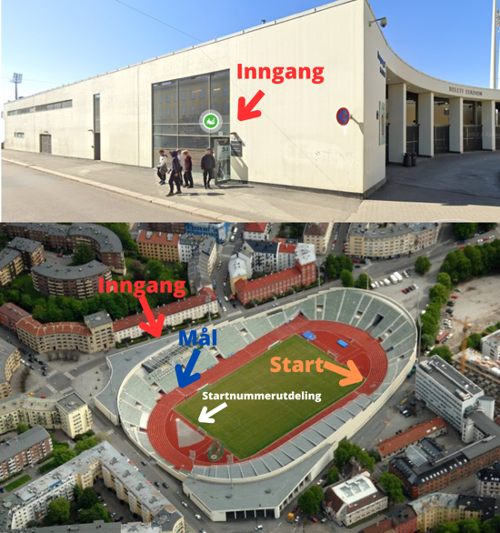 Inngangen til Bislett Stadion er den vanlige inngangen når man trener der, Sofies gate 38. Se bilde lenger ned for inngang og utdeling av startnummer. Det er mulig å benytte dusjene og garderobene på arenaen.